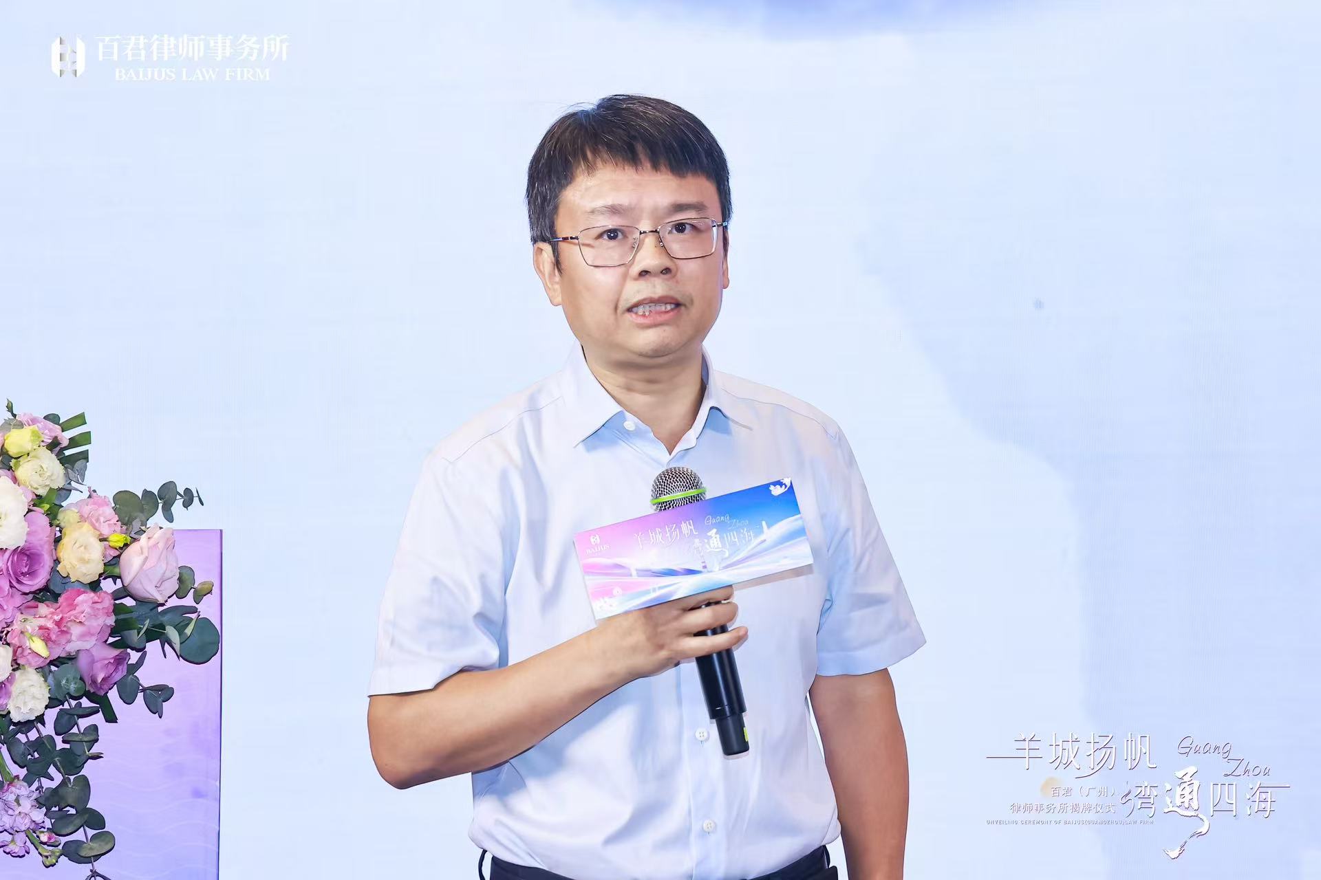 广东省西南政法大学校友会会长、广东省律师协会名誉会长、广州金鹏律师事务所创始人王波在致辞中衷心祝贺百君广州所开业。他表示,百君从西部走向全国,短时间内在北上广相继落子,展现出百君所的非凡魄力与战略眼光。广州是一个创业的好地方,期待百君人在怀抱远大理想的同时,秉持执着的精神,在大湾区无惧风雨,扬帆远航,创造出西部律师在大湾区的灿烂篇章。